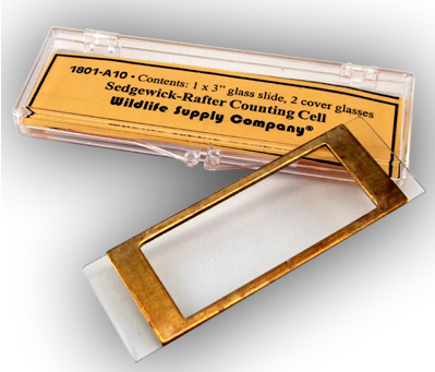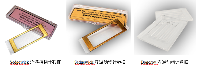 Sedgewick浮游植物/浮游動物計數框:容積1.0ml,重0.17kg。2.5×7.5cm玻璃板,上有銅質框,框大小50×20×1mm;蓋玻片2.5×6cm。浮游植物計數框被分割為100小格,分割線寬0.18mm。