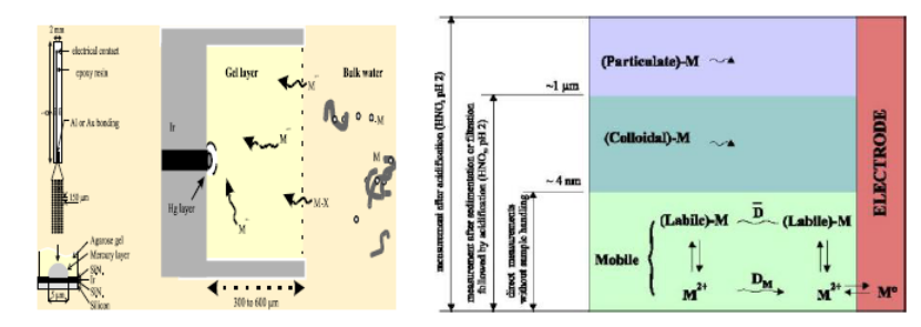 專利化的新型凝膠-微孔膜傳感器是VIP DEEP BLUE分析儀的核心部件,探頭的表面包裹有汞層和親水性的凝膠保護膜,可將有機物質、無機膠體以及顆粒物質排除在凝膠層外,避免了在傳感器表面的吸附作用而帶來的干擾。特制微孔傳感器由5×20個相連接的銥微型圓片陣列組成,工作電極的表面積很小,電解富集時,能起到濃縮作用,使得電極表面汞齊中金屬的濃度相當大,溶出時產生的電流信號大,所以具有高靈敏度和可靠性。